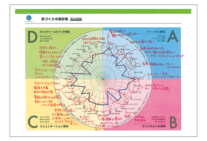 私たちは美しい家づくりを推進していますが、家づくりでいちばん大切なのは「家族の距離感」であり、「人と人との結びつき」だと思っています。「いい絆が生まれる」「家族の団欒が弾む」-そういう家にしていくことが、最も重要なことではないでしょうか。ワークホームズでは、家族や友人と空間を共有する良さを味わえる家づくりを実現するために、まずイメージチェックシートから導き出す「家づくりの羅針盤」を使ってお客様とコミュニケートし、意識を共有することから始めています。