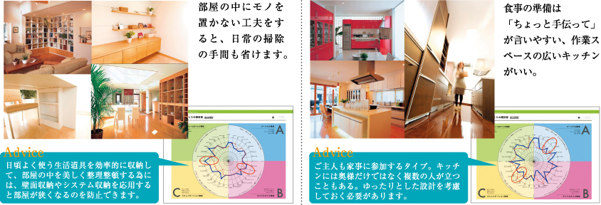 家づくりの羅針盤の分析による、お客様のライフスタイルに合わせた生活シーンのご提案をしながら、ご家族の思いを確認します。そこからインテリアや設備のイメージも膨らませていきます。